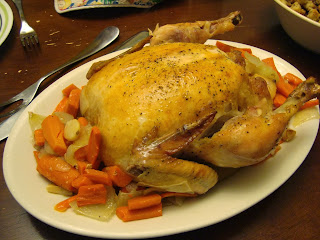 I cut up some onions, carrots, and garlic, and put them in a deep baking dish. Then I rubbed the chicken (it was about 4 lbs.) with olive oil, sprinkled it with salt and pepper, and inserted small pieces of garlic in between the skin and the meat. I roasted the chicken for 15 minutes at 450 degrees, then turned the temperature down to 375 degrees and baked it for an hour more. At that point it was nice and brown but the meat near the bones was still a little pink, so I put a lid on the baking dish and baked the chicken and veggies for 20 more minutes covered at 375.